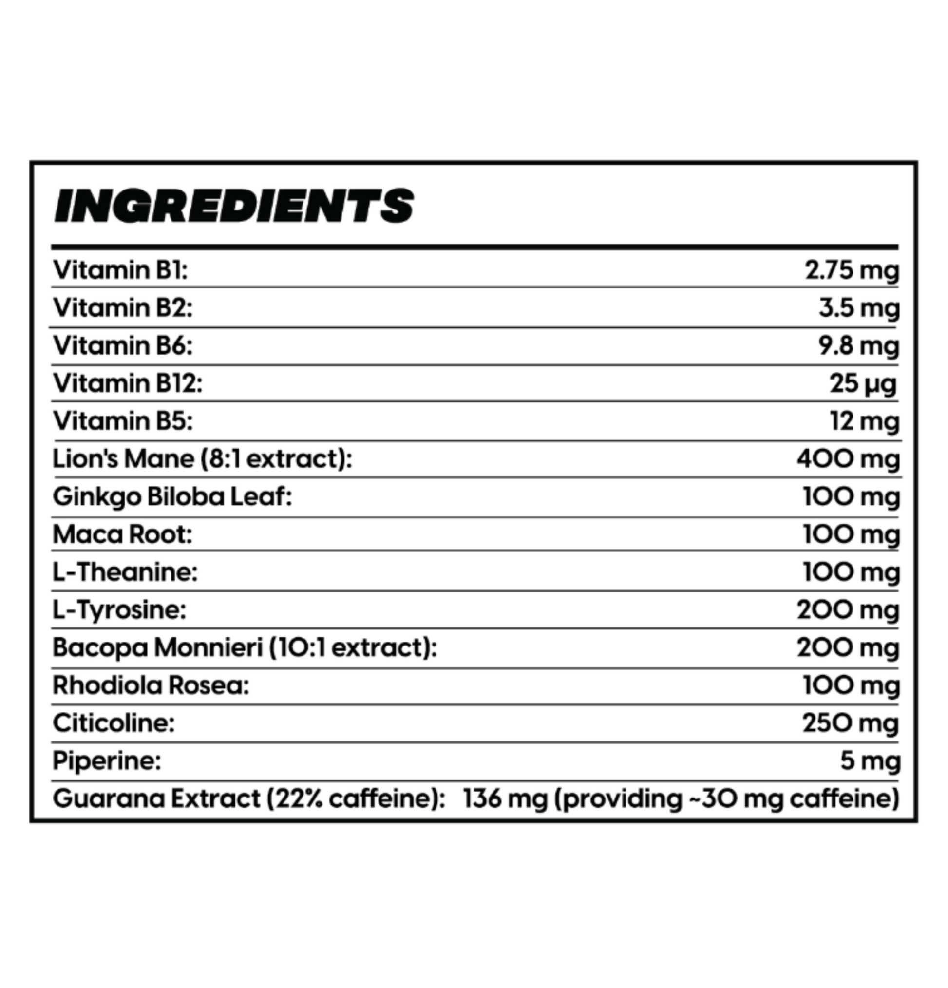 Guarana Extract (22% caffeine): 136 mg (Provides ~30 mg caffeine)